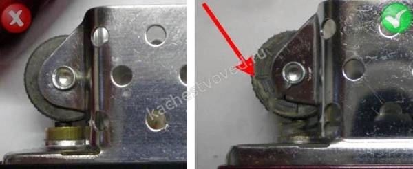 Флинтовый колесик — оригинальные зажигалки Zippo имеют колесико с тремя возбужденными точками контакта. Это помогает достичь стабильной и надежной работы. Подделки могут иметь колесико с менее чем тремя точками контакта.