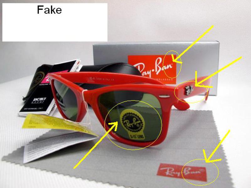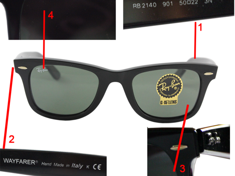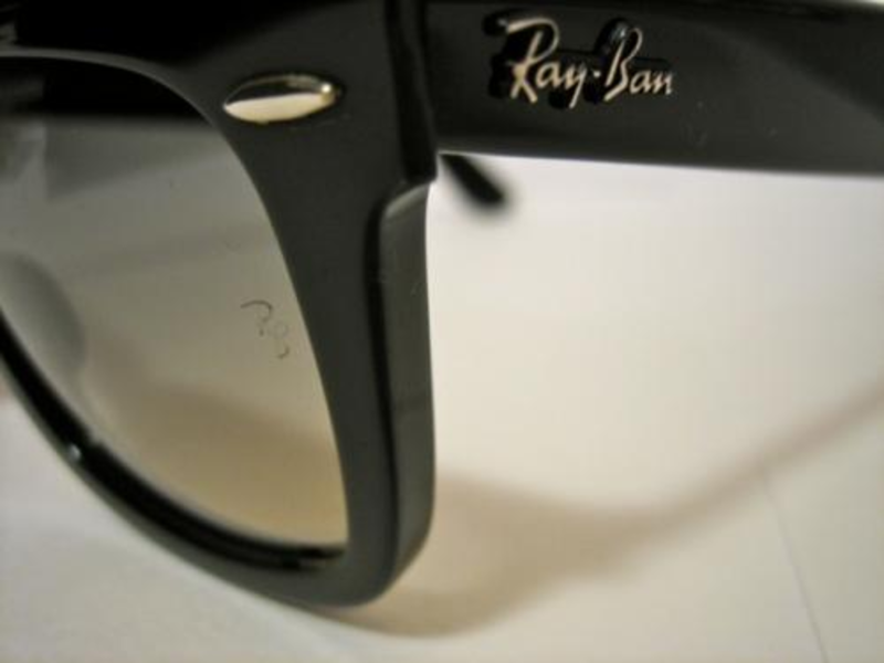 — На левом стекле очков нанесена лазерная гравировка сокращенного названия «RB», ее можно обнаружить на ощупь. На подделках ее чаще всего наносят краской, которая довольно легко стирается.