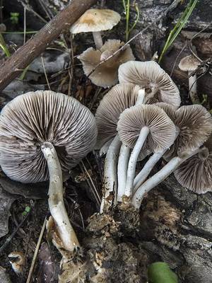 Пластинки: приросшие, частые, тонкие, по мере роста изменяют цвет от белого до серо-фиолетового и даже тёмно-коричневого.