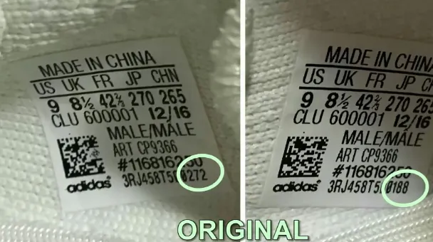 На фальшивых этикетках содержится информация о том, как ухаживать за инструктором. Оригинальная спортивная обувь имеет ту же информацию, которая указана на информационной этикетке внутри коробки.