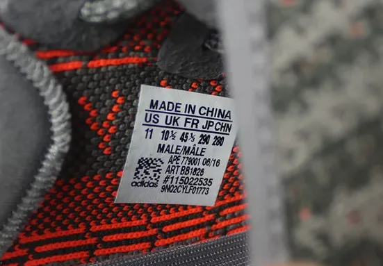 При этом есть способ, как отличить Yeezy 350 от подделки по коробке. Для этого смотрите на информационную наклейку. Здесь должны присутствовать такие элементы: