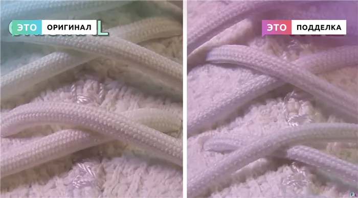 - Шнурки. Настоящие шнурки мягкие, а также приятные на ощупь. У копий плотные и жесткие. Также отличается рисунок и качество исполнения.
