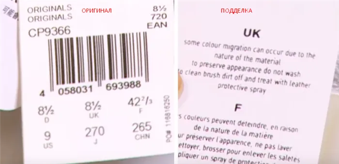 К обуви прикрепляется картонный ярлык, только оригинал прикрепляется к левому ботинку, а подделки — к правому.