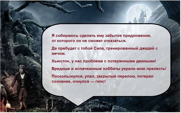 Правильный ответ: забытое предложение, тренированный джедай, с потерянными данными, испачканные хоббиты, закрытый перелом.