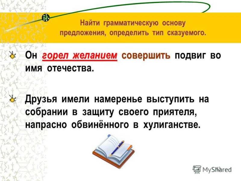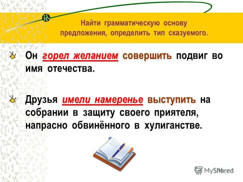 Составное глагольное | 1) Фазовый или модальный глагол в личной форме + инфинитив смыслового глагола. | 1) Я мечтаю сыграть роль на сцене. |
