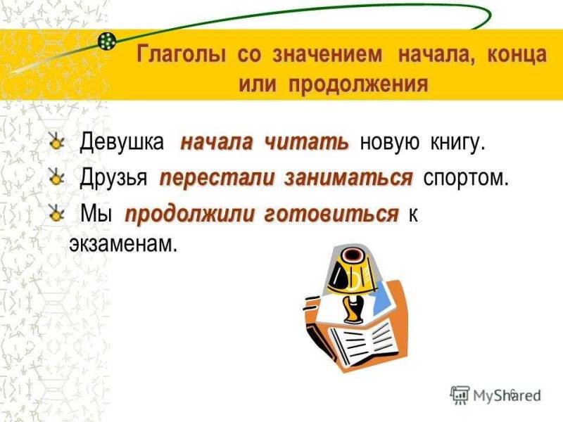 | — со значением начала, конца, продолжения действия: начать, перестать, кончить, прекратить, продолжить и др. |