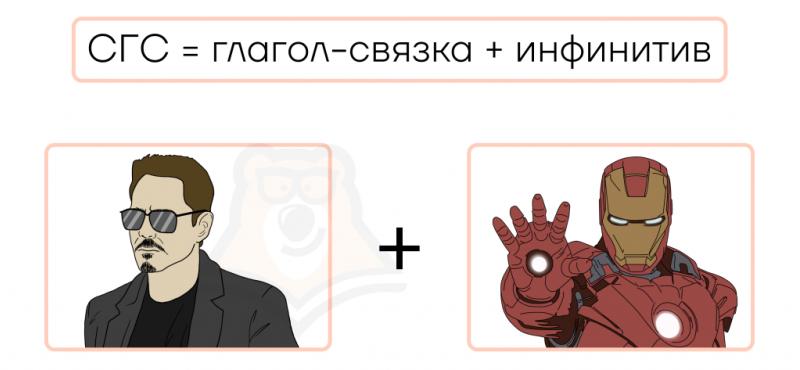 Второй тип — составное глагольное сказуемое (СГС) — отличается только тем, что вместо одного глагола у нас появится несколько: один будет вспомогательным, другой будет выражен инфинитивом и нести основную смысловую нагрузку.