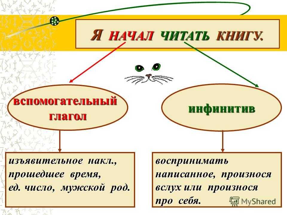 Составное глагольное | 1) Фазовый или модальный глагол в личной форме + инфинитив смыслового глагола. | 1) Я мечтаю сыграть роль на сцене. |