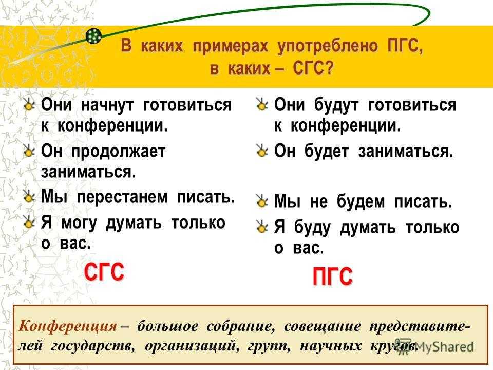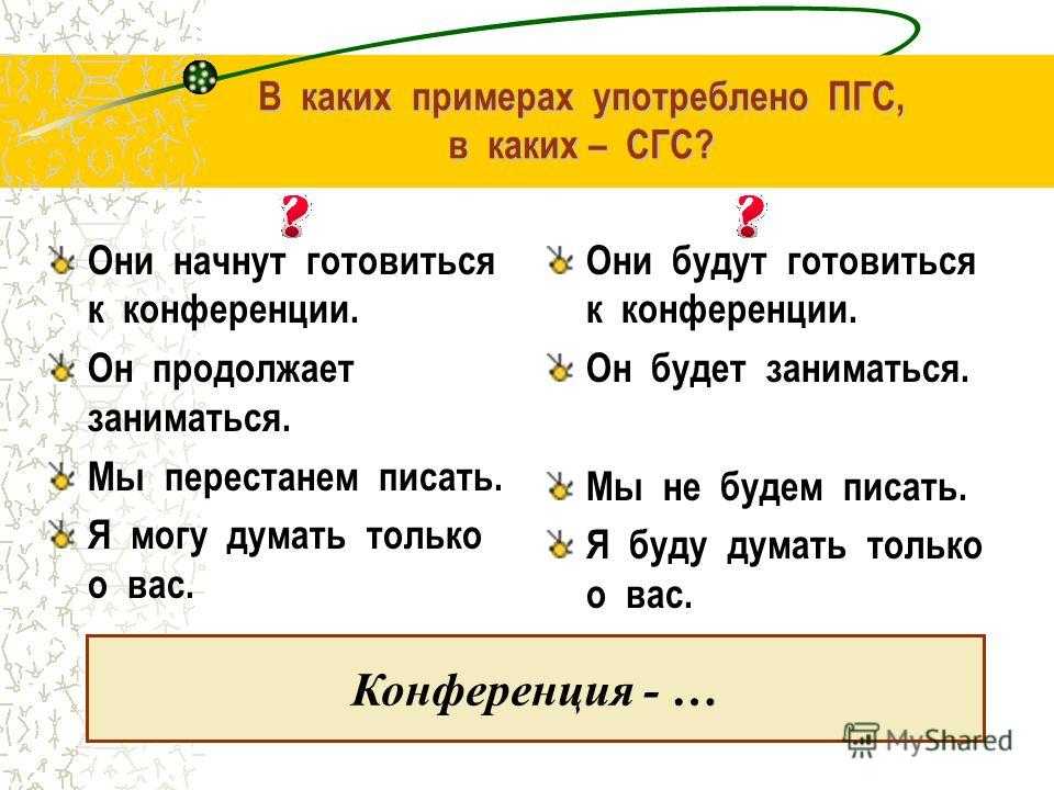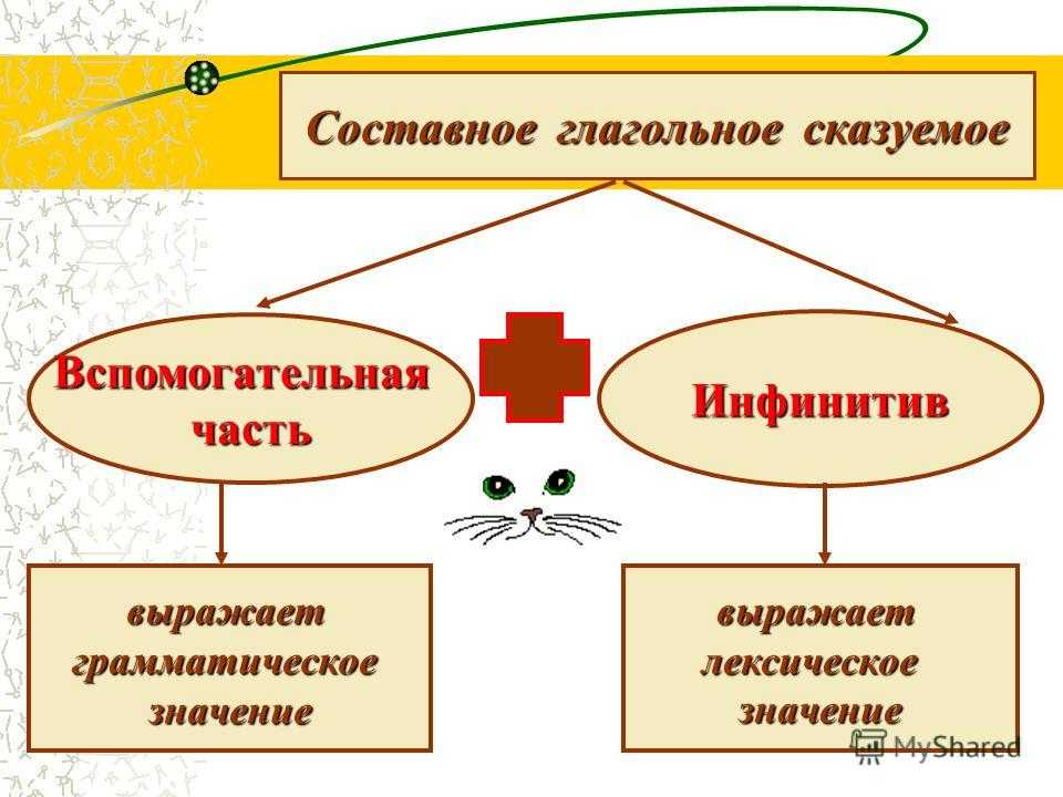 Второй тип — составное глагольное сказуемое (СГС) — отличается только тем, что вместо одного глагола у нас появится несколько: один будет вспомогательным, другой будет выражен инфинитивом и нести основную смысловую нагрузку.