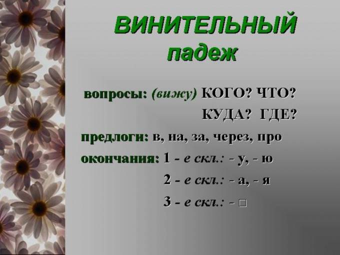 Имя существительное в винительном падеже обозначает объект, на который направлено действие. В этой падежной форме используются следующие слова служебной части речи: