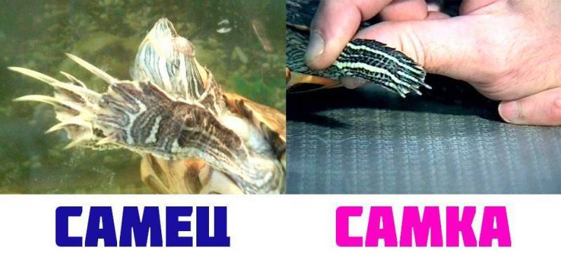 Когти, как это ни странно, помогают определить половую принадлежность рептилии лучше, чем все остальные критерии. Достаточно один раз увидеть фото или видео «пальчиков» передних лап мужской и женской особи красноухой черепахи, чтобы оценить и запомнить их принципиальные отличия.