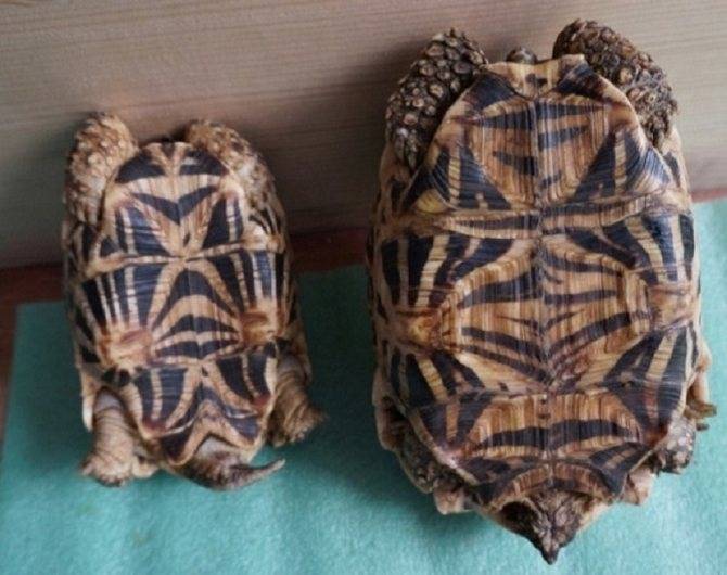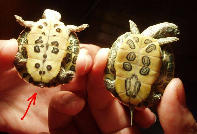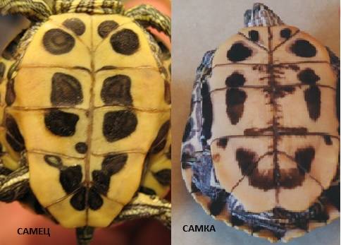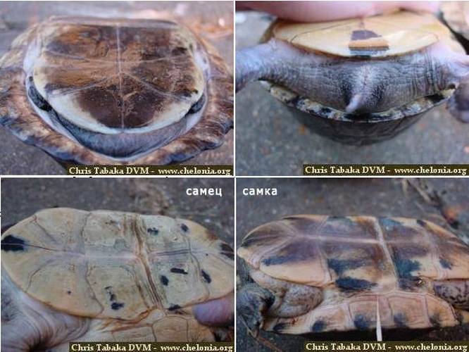 Панцирь. Для определения пола по форме панциря, черепаху необходимо перевернуть брюшком вверх. У самцов нижняя часть длинная и вытянутая, имеет форму буквы V в хвостовой части. Пластрон (брюшной щит панциря) будет немного вогнут. Такая форма помогает самцам удерживаться на панцире самки в момент оплодотворения. У самок пластрон широкий с ровной поверхностью.