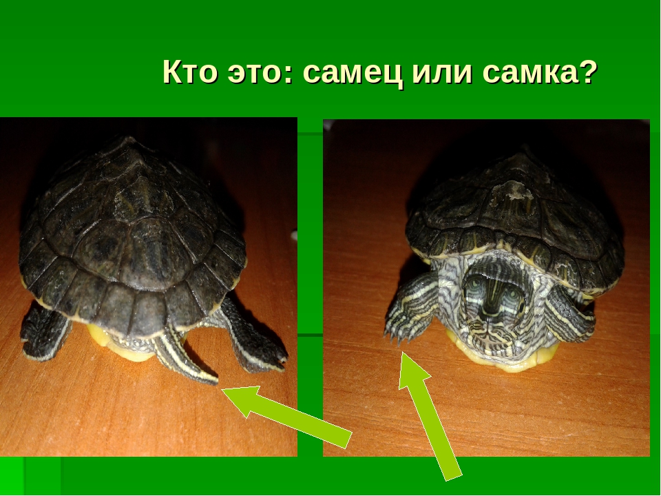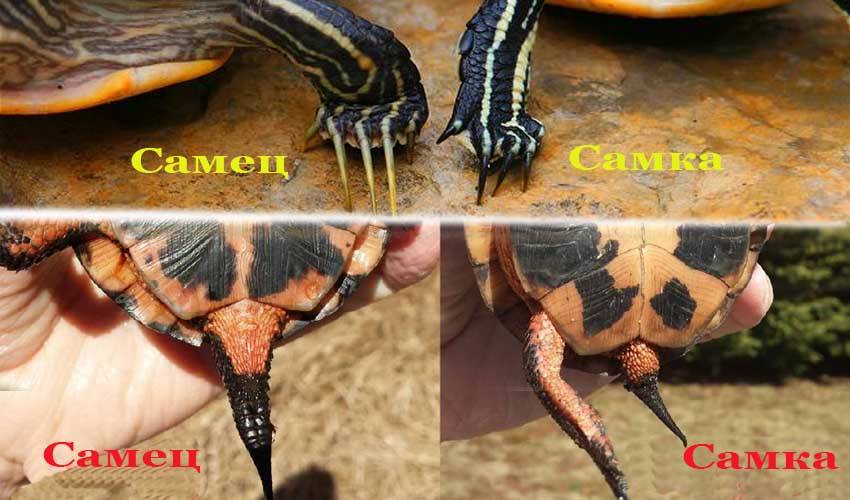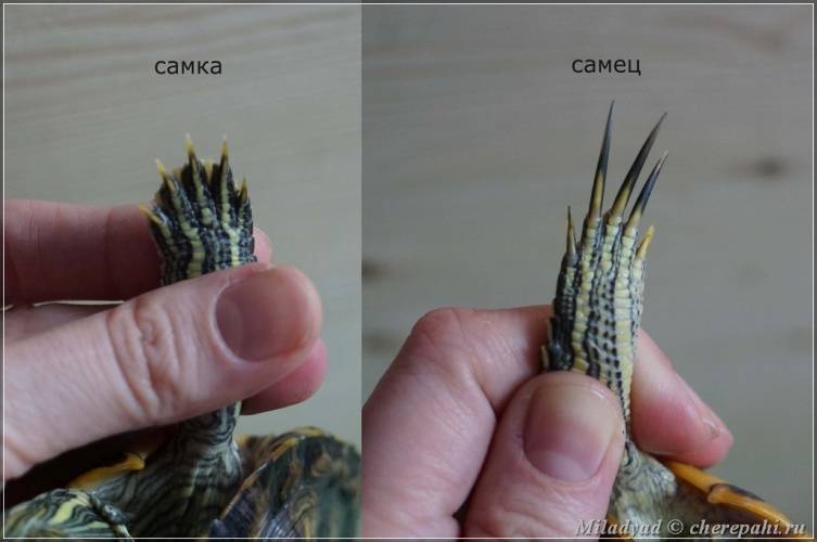 Когти, как это ни странно, помогают определить половую принадлежность рептилии лучше, чем все остальные критерии. Достаточно один раз увидеть фото или видео «пальчиков» передних лап мужской и женской особи красноухой черепахи, чтобы оценить и запомнить их принципиальные отличия.