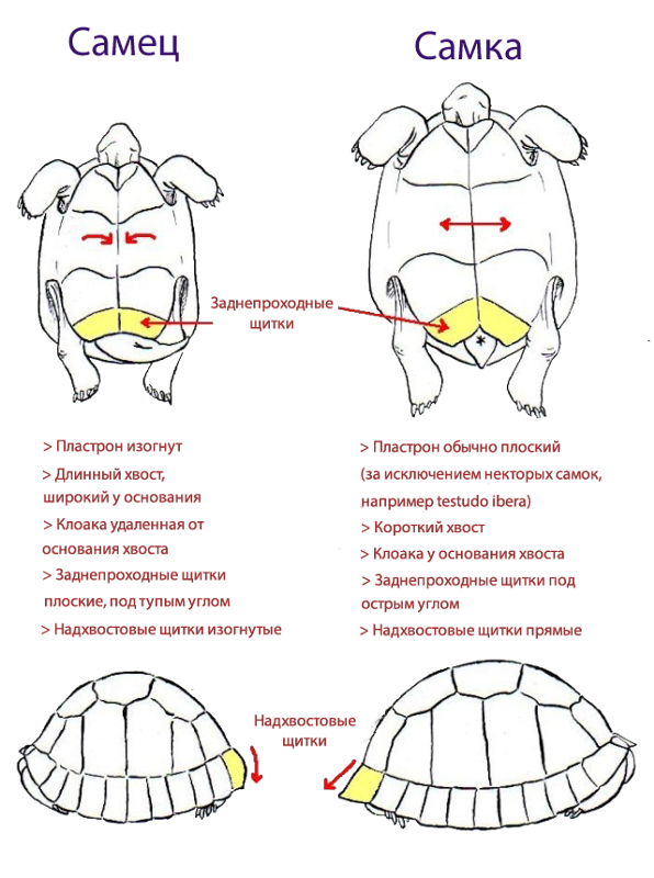 - В районе хвоста пластрон у мальчиков заострён, у девочек — закруглён.
