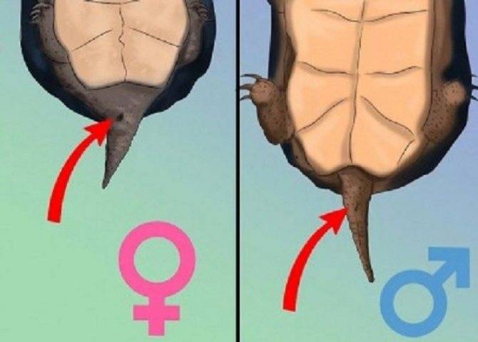 Клоака. Чем взрослее черепаха, тем точнее можно определить пол по расположению клоаки. У самок клоака расположена близко к панцирю, практически у самого основания, и имеет форму звездочки. У самцов клоака находится на значительном расстоянии от панциря, практически на краю хвоста, и похожа на поперечную линию. Чем старше черепашка, тем длиннее хвост, на котором расположена клоака, соответственно тем точнее будет результат.