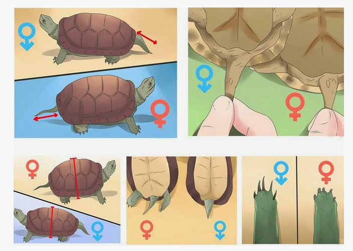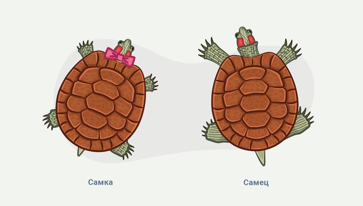 У большинства видов черепашек мальчики крупнее девочек, так как самкам нужно вынашивать яйца. Исключение составляют галапагосские (Geochelone nigra), южноафриканские клювогрудые (Chersina angulata), пустынные, коробчатые (Terrapene carolina) черепахи, болотные черепахи Мюлленберга (Clemmys muhlenbergii), американская болотная (Emydoidea blandingii), каймановая и желтая иловая (Kinosternon flavescens) черепахи.