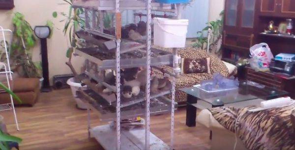 - Размещают клетки на высоте 75 см от пола. Это значительно упрощает уход за птицами. Нежелательно сооружать конструкции более чем в 3-4 яруса.