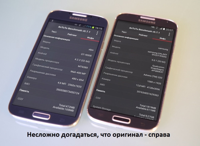 Дешевые модели (вроде Galaxy J2) могут оснащаться процессорами Spreadtrum, но в серьезных моделях такие CPU никогда не применяются. А именно модели среднего и верхнего ценового диапазонов становятся жертвами подделок. Если в смартфоне, который выдают за Galaxy S7, AnTuTu показывает чип MediaTek или Spreadtrum, то «дело пахнет керосином». Очевидно, такой девайс лучше не брать, так как это поделка.
