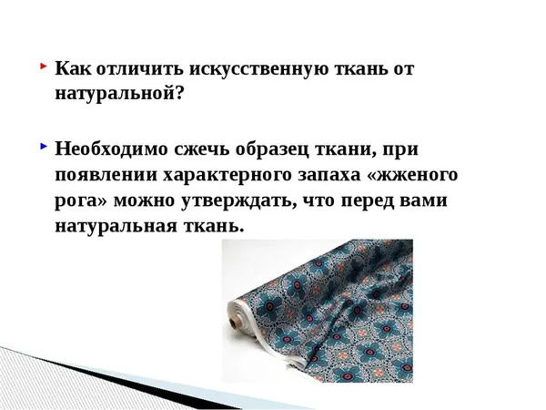 Синтетика плохо проводит тепло, поэтому если подержать ткань в руке, она будет оставаться прохладной. При горении она плавится, распространяя кислый запах.