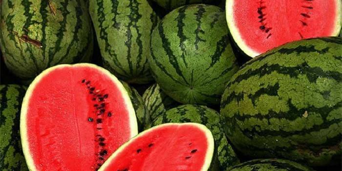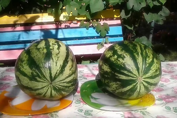 Ягоды этого вида никогда не вырастают слишком большими – их вес в большинстве случаев не превышает 10 кг. Если вам будут демонстрировать 15-20-килограммового гиганта и при этом уверять, что перед вами херсонская разновидность, то не верьте этому – он либо другого типа, либо его выращивали с использованием большого количества нитратов. Арбуз имеет округлую форму и среднюю толщину коры в 9-12 мм. Мякоть красного цвета, сладкая, сочная, зернистая, поэтому этот вид пользуется большой популярностью.