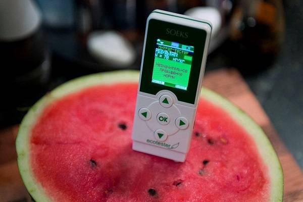 Наличие нитратов можно проверить опытным путём. Кусок арбузной мякоти помещают в стакан с водой. Если жидкость слегка мутнеет, с плодом всё в порядке. Окрашивание воды в розовый цвет — сигнал о превышении концентрации химикатов. Наиболее точно количество нитратов определяется с помощью приборов: нитратомера, экотестеров (допустимая концентрация вещества — 60 мг в кг сырой мякоти).