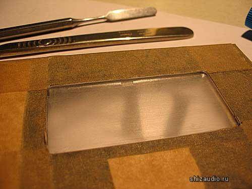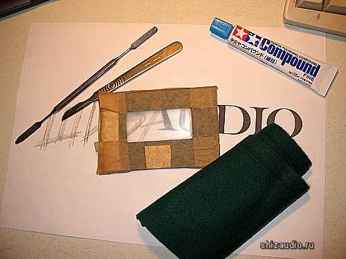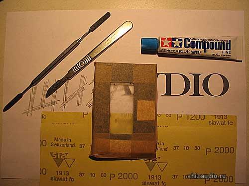 1. Что нам потребуется: скотч, бумага, скальпель, лопаточка, шкурка 800, 2000 и бархотка или мягкая тряпочка.Если есть возможность демонтировать деталь, лучше это сделать, так работать будет удобнее.Оклеиваем рабочую поверхность с нахлестом скотча 1-2 мм. Скотч следует использовать проверенный, есть агрессивные клеи, которые могут повредить надписи. Я использую свой профессиональный скотч для оклейки багетов. Скальпелем аккуратно обрезаем лишний скотч, лопаткой делаем правильные закругления в углах и заталкиваем лишний скотч в щель между стеклом и корпусом.(если вы можете снять стекло, лучше так и сделать, я в этом случае делать этого не стал и пошел трудным путем)