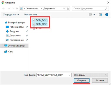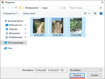 Откроется окошко для выбора. Чтобы добавить один файл просто щелкните по нему два раза левой кнопкой мыши. А чтобы добавить несколько – удерживайте клавишу Ctrl и кликайте по каждому из них. Затем нажмите «Открыть».
