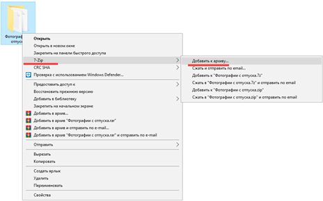 Кстати, в случае с последним алгоритм архивации окажется немного иным: в появившемся после нажатия по папке контекстном меню необходимо выбрать пункт 7-ZIP (на одном из скриншотах выше это отлично показано).