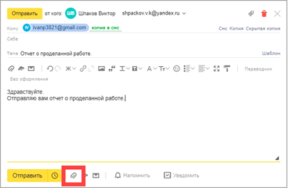 2. Заполните форму, как мы это делали . Чтобы прикрепить файл, щелкните по иконке скрепки справа от кнопки «Отправить».
