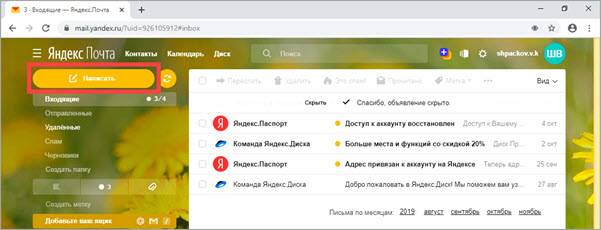 - Войдите в аккаунт почты Яндекс и нажмите кнопку «Написать».