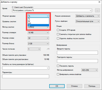 Также можете применить дополнительное сжатие в пункте «Метод сжатия», что немного уменьшит размера архива.