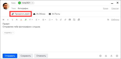 - Точно также создайте письмо и нажмите кнопку «Прикрепить файл».