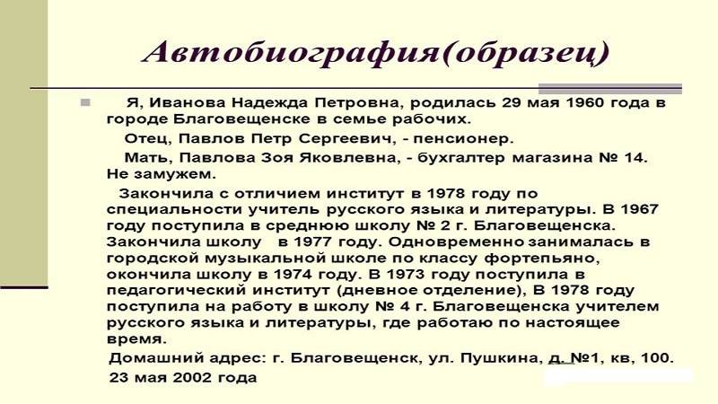 Естественно, в ваших интересах написать больше уважительных причин, по которым вам приходилось менять место работы, а также больше указать достижений и наград. Например, если написать автобиографию необходимо школьнику, то в тексте необходимо сделать уклон на достижения в учебе, участие в дополнительных образовательных мероприятиях (олимпиадах, конкурсах, выставках). Родился в семье учителей — отец учитель физкультуры, мать учитель украинского языка. Поэтому человек, который не связан какими-либо регуляторами, самостоятельно описывает свою жизнь.