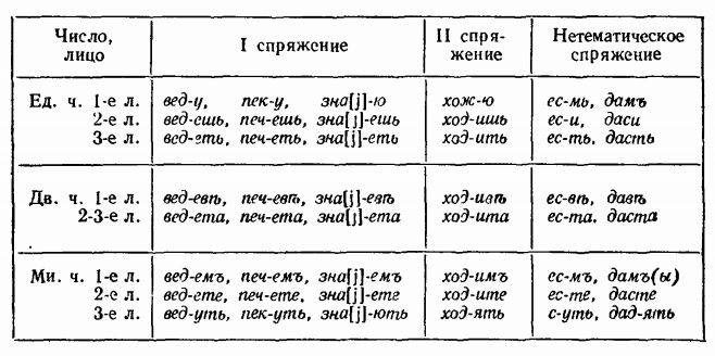 Более того, спряжение форм настоящего времени в древнерусском языке было представлено тремя типами — I, II и нетематическим, которые различались лишь отдельными окончаниями.