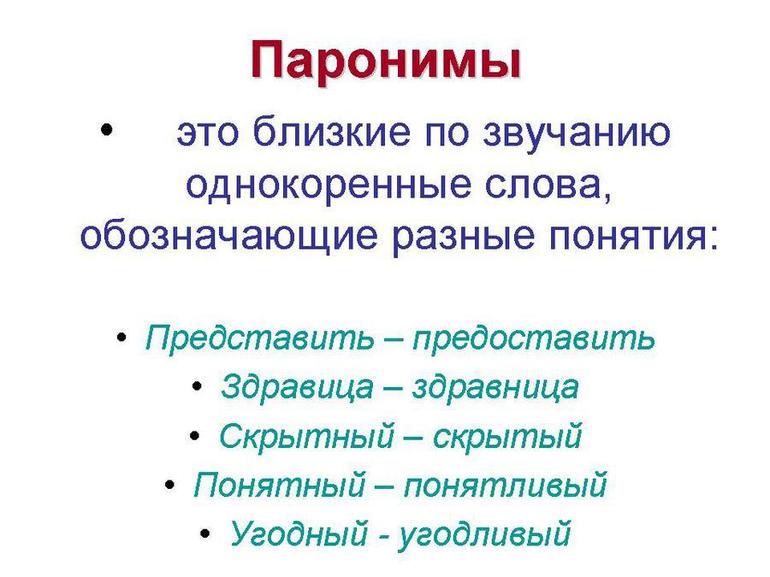 Паронимами называют однокоренные слова из одной и той же части речи с незначительным различием – всего в одной букве, поэтому звучат и пишутся они очень похоже. Даже ударение и то в таких словах ставится на одну и ту же букву, что еще более затрудняет их верное написание. Однако не смотря на всю схожесть следует помнить, что слова эти не являются синонимами и имеют разное значение. Если в предложении вы используете один пароним вместо другого это будет считаться лексической ошибкой, ведь она может изменить весь смысл сказанного.