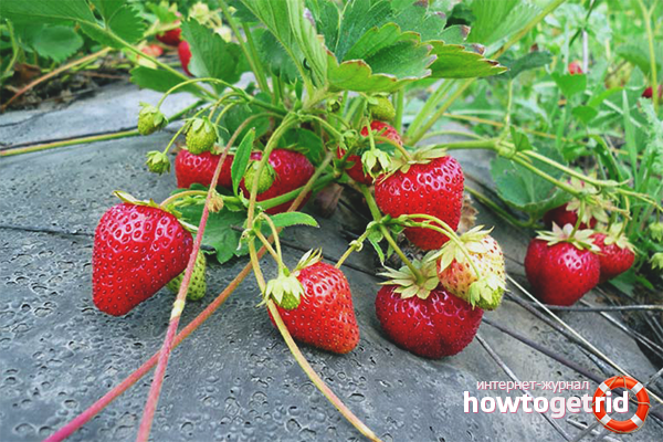 Землю вокруг кустов земляники нужно мульчировать. Грунт посыпают сосновыми или еловыми иголками. Аромат хвои отпугивает медведку, колорадского жука и других вредителей. Еловые иголки заменяют соломой. Заготовку сначала замачивают в воде и выкладывают тонким слоем на пленку или лист железа, оставляют на солнце. Ждут, пока прорастут семена сорняков. Чистую и сухую солому разбрасывают между рядами и под кустами. Аналогичным способом используют сено или сушеную траву.