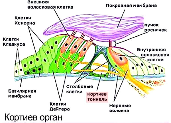 Тоннель есть и в каждом из нас. И не только в нас, но и во всех четвероногих млекопитающих (за исключением некоторых примитивных сумчатых и землероек). Вы, вероятно, уже догадались, что этот тоннель не пищеварительный тракт. Гляньте на рис. справа: это кортиев тоннель, важная часть кортиева органа – части внутреннего уха, непосредственно воспринимающей звуковые колебания. Точный медицинский термин и, пожалуй, единственный тоннель, на грамматике которого можно «погореть»: студент-медик, назвавший кортиев тоннель туннелем, рискует «жбаном» и пересдачей.