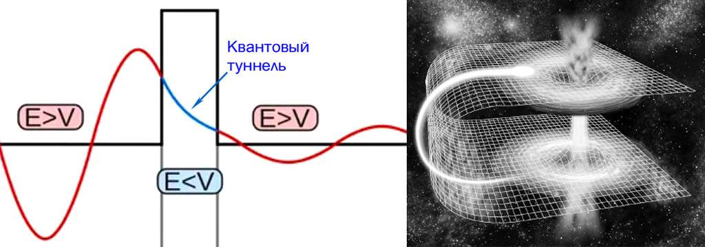 Второй физический туннель – космического масштаба, релятивистский. Это тоже теоретическая конструкция, которую в популярных источниках и в совершенно серьёзных научных работах называют кротовой норой или червоточиной. Суть предполагаемого явления в том, что при определённых условиях в деформированном пространственно-временном континууме может возникнуть туннель в пространстве-времени, соединяющий два его пункта, так сказать, накоротко, не по «нормальной» траектории в зримом пространстве, справа на рис. Теоретически тут выходит, как и в квантовом туннелировании: был, допустим, звездолёт размером с город на орбите вокруг Луны, и вдруг – бац! – оказался где-то возле Сигмы Дракона.