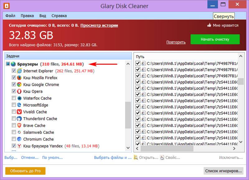 Glary Disk Cleaner не только тщательнее чистит временные файлы, а предусматривает больший перечень типов системных данных для очистки. Утилита также чистит кэш браузеров, их в числе поддерживаемых здесь большой перечень, есть даже малоизвестные.