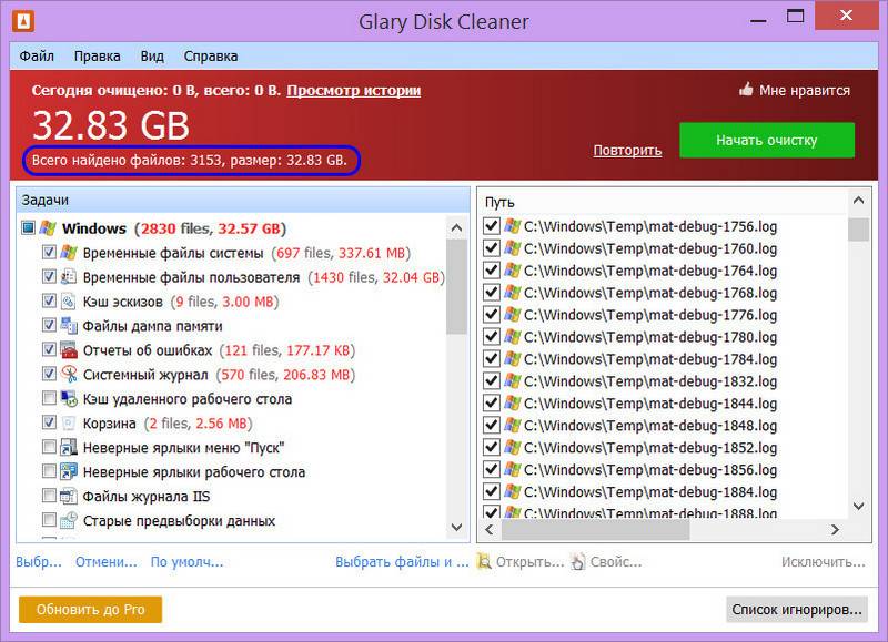 Чем она примечательна? В одной и той же захламлённой Windows эта утилита выявила почти 33 Гб мусора, тогда как рассмотренное выше классическое штатное средство очистки – только 23 Гб с немногим. И, опять же, значительную часть из найденного мусора составляют временные файлы.