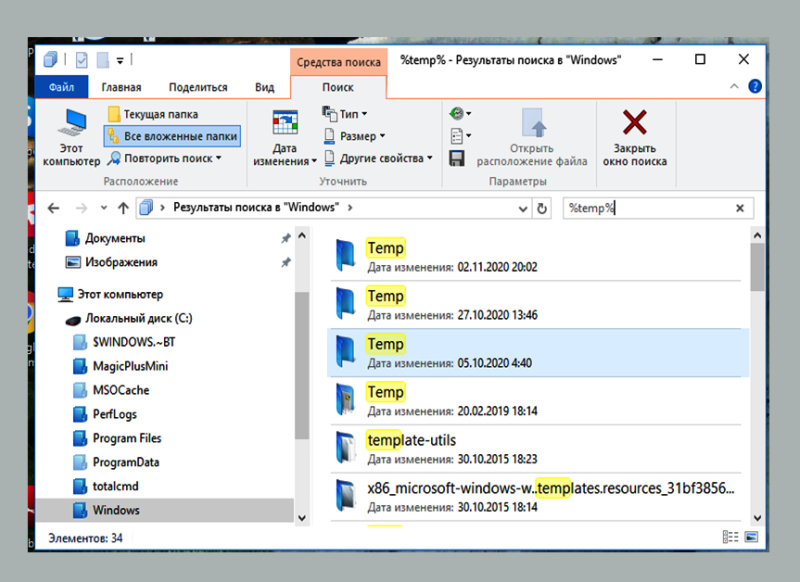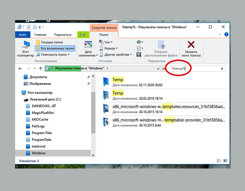 Открываю её и опять ищу временные папки, введя“%Temp%” в поле поиска.