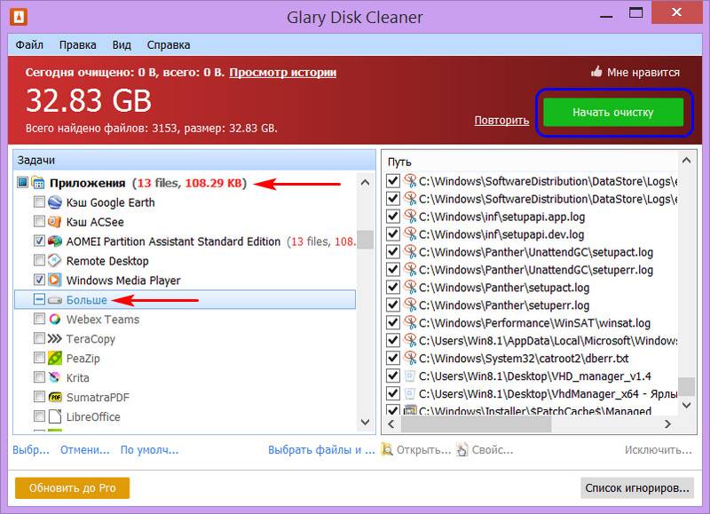 И ещё утилита предусматривает чистку кэша сторонних программ. В числе поддерживаемых их немало, полный перечень откроется при нажатии опции «Больше». Если какие-то типы данных не отмечены галочкой, отмечем и жмём опцию «Повторить» для пересканирования диска С. Затем жмём «Начать очистку».