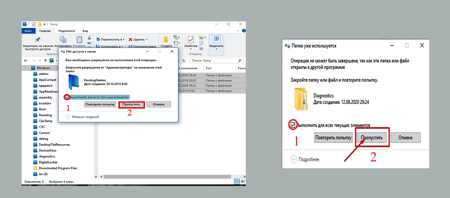Подтверждаю запрос на удаление, нажав кнопку “ОК”. Если выскакивают окна с ошибками. Для любой ошибки ставлю галочку () и нажимаю “ПРОПУСТИТЬ” (). Это системная папка. Ненароком могу испортить систему.