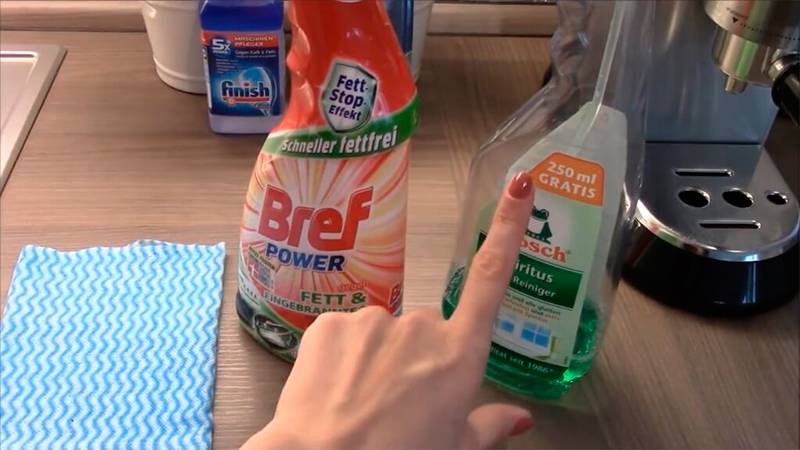 В тех случаях, если посудомоечная машина долго не запускалась и жир успел высохнуть, отмыть его можно средством для чистки духовок и варочных поверхностей.