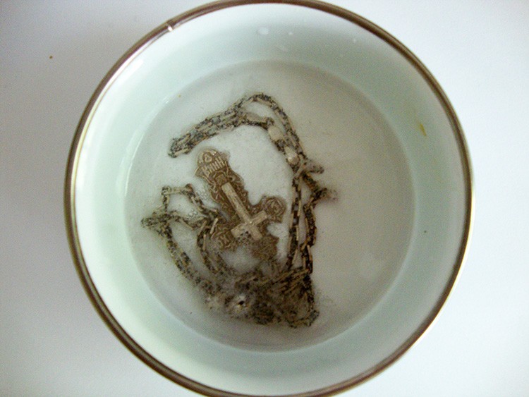 Еще одно средство, которым можно эффективно убрать черноту — смесь из тертого хозяйственного мыла и нашатыря (10%). Нужно соединить оба ингредиента и греть смесь на водяной бане до 80℃. Жидкость немного остудить и с помощью ватной палочки обработать поверхность кольца.Если украшений из серебра очень в много, гораздо проще купить ультразвуковую ванночку и чистить изделия в ней.