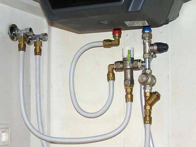 - На входном и выходном патрубках проточной системы нагрева воды накручиваются шланги, соединяющие, бойлер с запорной арматурой.