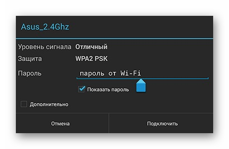 - Высветится небольшое окно, в которое нужно ввести пароль для подключения планшета к интернету.