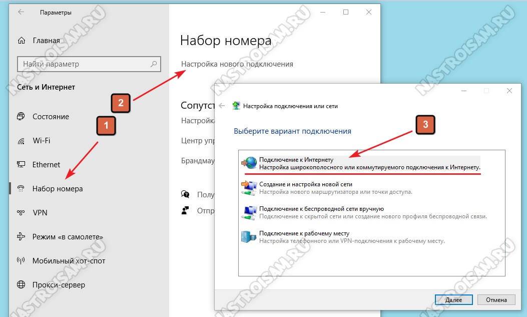 Этот протокол используется у Дом.ru, МТС а так же в большинстве филиалов Ростелеком и ТТК. Настройка PPPoE в Windows 10 сводится к тому, что нужно зайти в параметры операционной системы, открыть раздел Сеть и Интернет и в меню выбрать пункт Набор номера.
