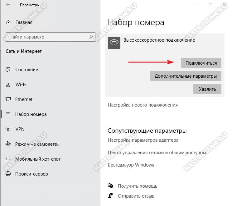 Для этого снова открываем в параметрах Windows 10 раздел «Сеть и Интернет» -> «Набор номера» и, выбрав справа высокоскоростное подключение, нажимаем кнопку «Подключиться».