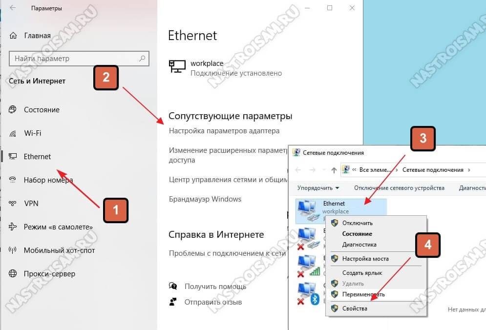 Там мы кликаем правой кнопкой мыши на подключение по локальной сети Ethernet, чтобы вызвать контекстное меню. Выбираем пункт «Свойства». Откроется окно настроек адаптера: